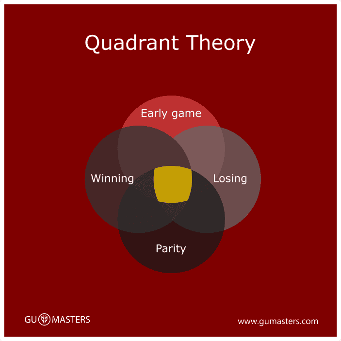 La Teoría de Cuadrantes fue desarrollada para Magic The Gathering y se atribuye a Brian Wong, pero es aplicable a otros juegos de cartas coleccionables. Consiste en dividir el desarrollo de una partida en cuatro posibles escenarios: